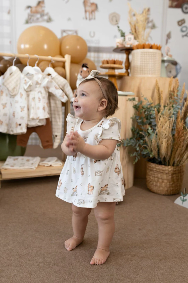 Body vestido com babadinho e com estampa Cavalinhos, com toque de extrema maciez e levaza sendo ideal para a pele da sua bebê.