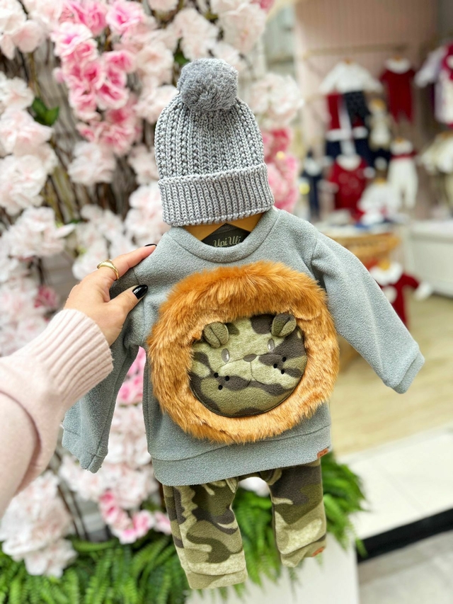 Conjunto leão camuflado em soft uma fofura bem quentinha para seu pequeno.