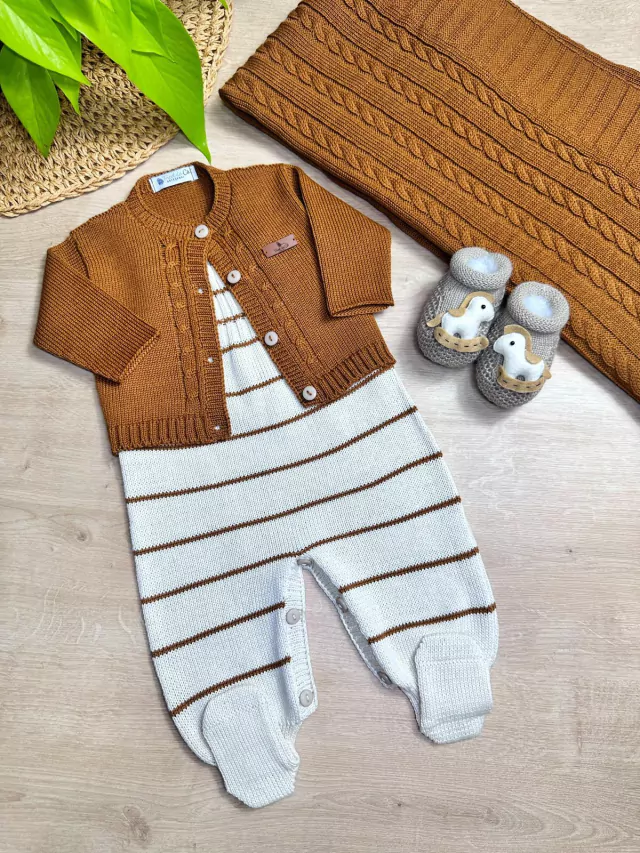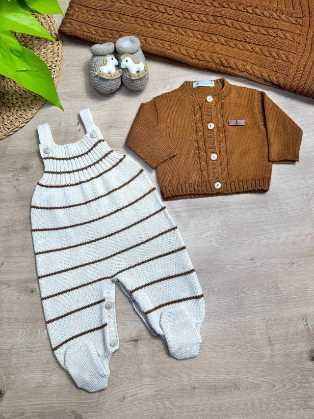 Macacão com Cardigan cor caramelo com muito charme e delicadeza, detalhe em trança.