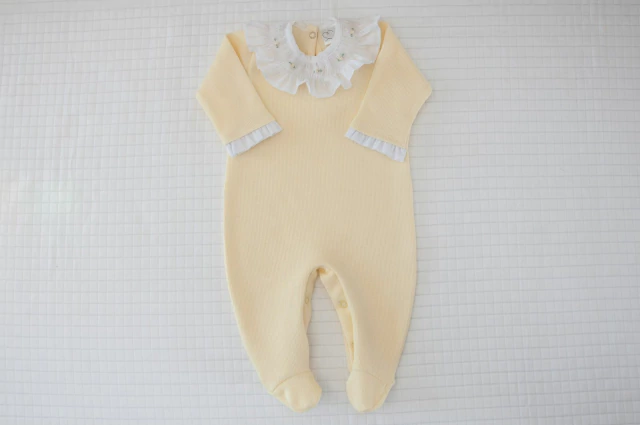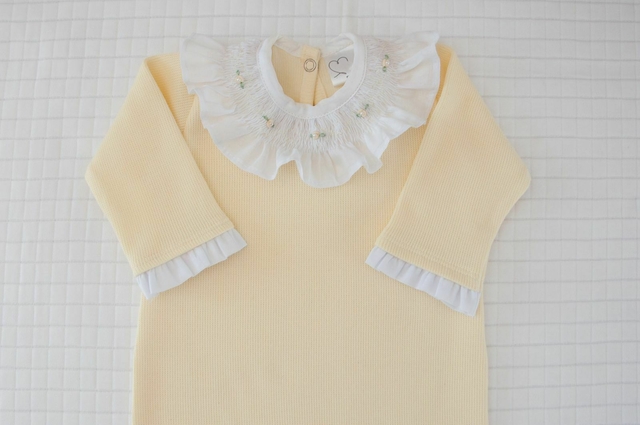 Macacão Tricotil na cor Amarelinha com golinha Rendada casinha de abelha;