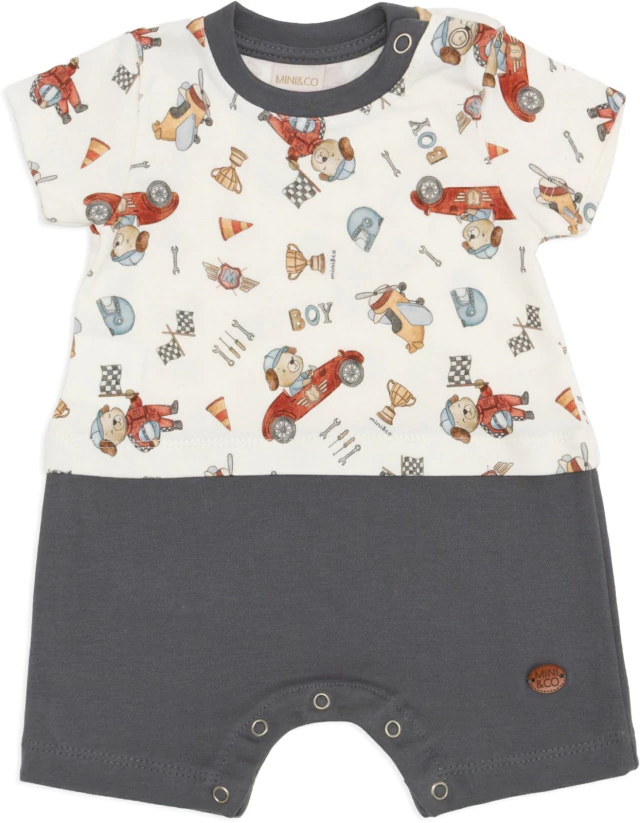 Macacão Curto com estampa Racer, com toque de extrema maciez e levaza sendo ideal para a pele do seu bebê.