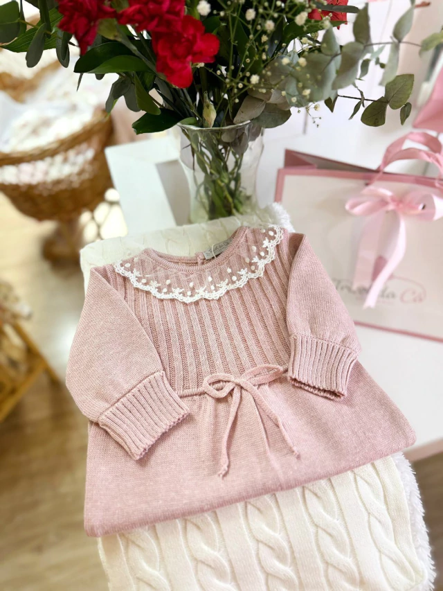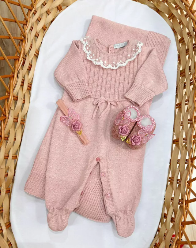 Macacão Filó na cor rosê tem um charme de renda junto ao próprio tricô, fica perfeito para sua princesa.
