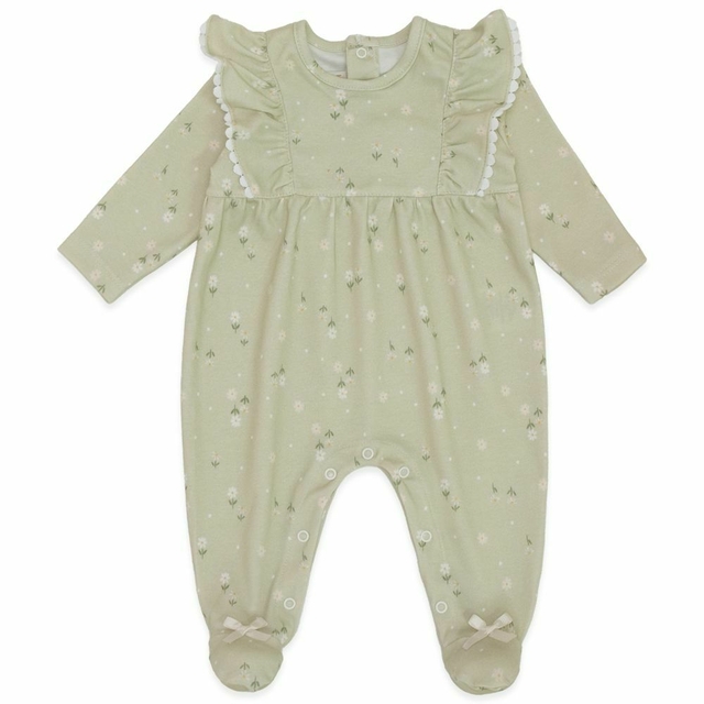Macacão delicado possui estampa floral suave na cor verde menta, com babadinho nos ombros e acabamento de mini pompns. Toque de extrema maciez e levaza sendo ideal para a pele da sua bebê.