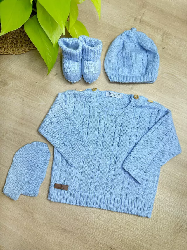 Suéter trança na cor azul bebê feito á mão dando toda a delicadeza na peça.
