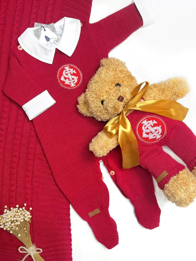 Roupa do ursinho em tricot em algodão. Produto com certificado e aprovado pelo Inmetro, enchimento feito com acrílico e fibra siliconada.